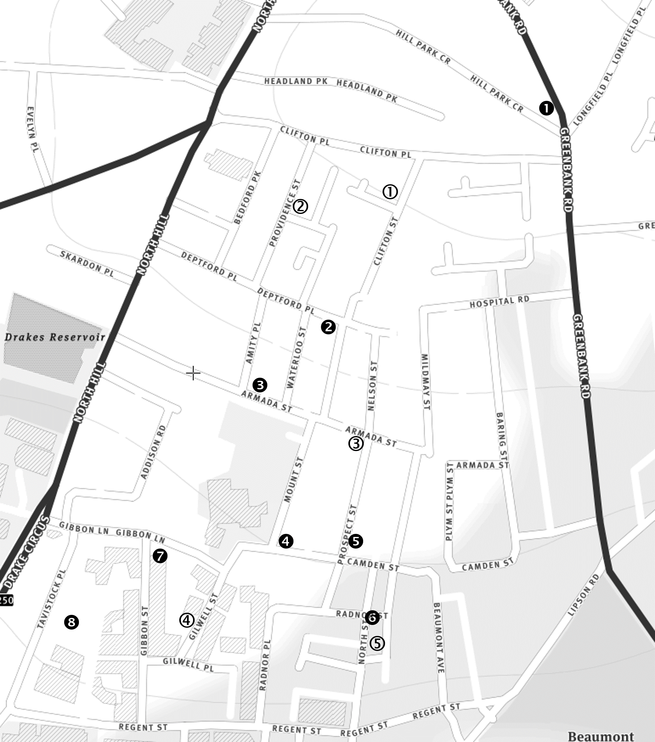 Closed down: 1. Hill Park Inn 2. Wellington Hotel 3. Friendship Inn 4. Sir Francis Drake 5. Prospect Inn 6. Radnor Inn 7. Grand Duchess, Clarence Arms 8. Plymouth Social Club