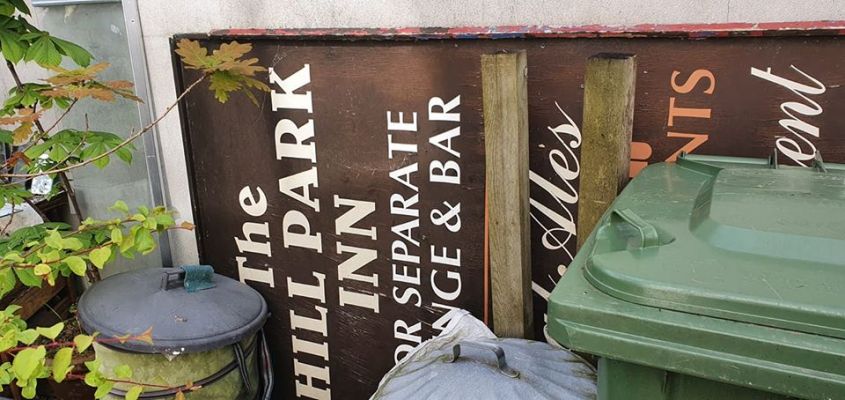 I remember sitting in the ‘beer garden’ of The Hill Park or ‘Hilly’ and a man called Kev was drawing this. I loved it right away and pestered him for ages until he sold it to me. It takes pride of place in my hall. The Hilly beer garden was small but a proper sun trap and very popular. I also have the sign from the side of the pub in my back garden, I took it out of a builder’s skip. After working and drinking in this pub for years I miss it so much.
